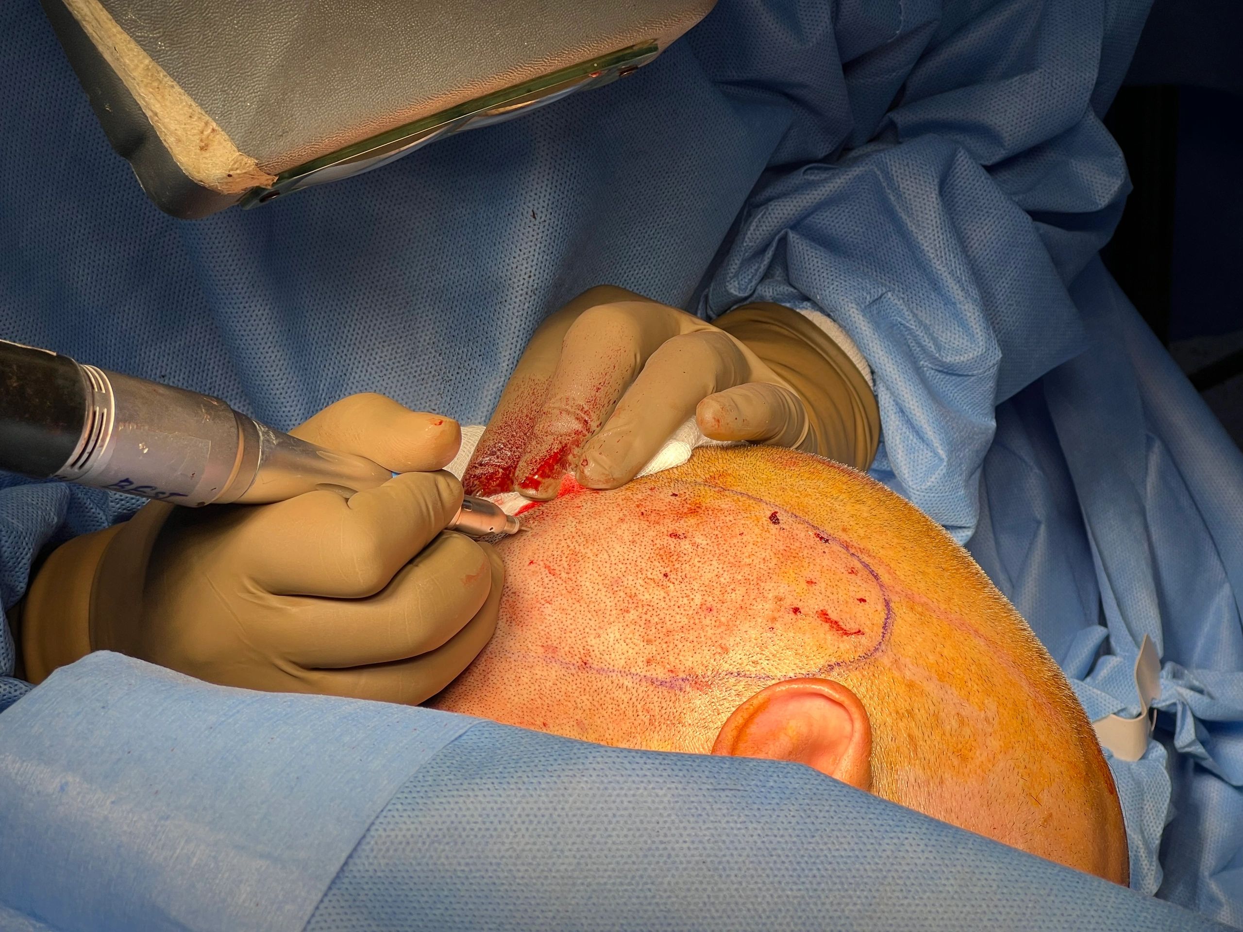 A strip of donor scalp is removed and follicles are dissected and transplanted. Allows a larger number of grafts in one session. Leaves a thin linear scar — hidden by hair. Generally lower cost per graft. Recovery typically 10–14 days. Best for patients needing high graft counts.